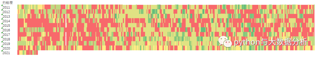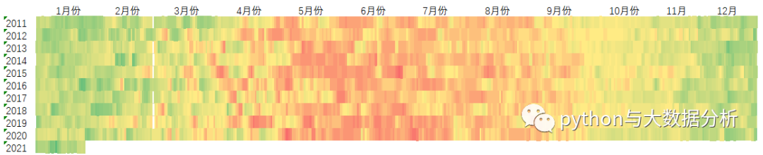 这是按最高温统计的2011年-2021年海口天气热力图,是上个图表的另类表达,对比起来会更加明显一些,2017年相对比较凉爽一些,2020年的冬天持续的时间会长一些。