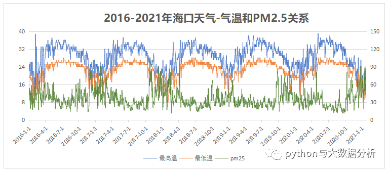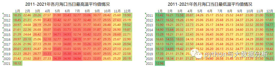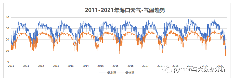 这是按最高温和最低温统计的2011年-2021年海口天气,和第一幅图看起来有天壤之别,而更有规律性,可以看到2015年、2020年冬天还是比较冷的,2020年冬天是这十年来最冷的。