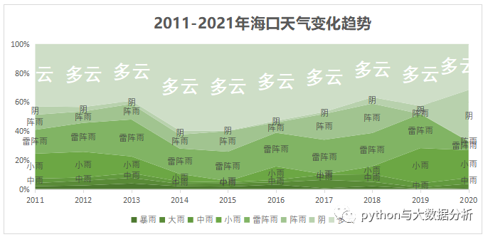 接下来是海口的天气情况,这是2011年到2021年海口的阴晴雨情况,红色表示,红色部分表示晴朗(多云也归到晴朗了),黄色是阴天,颜色越偏绿表示雨越大,可以看到海南平均有将近一半是晴天,其中2015、2016年有200天是晴天,2020年晴天最少,在120天左右;海南的雨季不像大家认为的是在冬天,还是夏天居多。