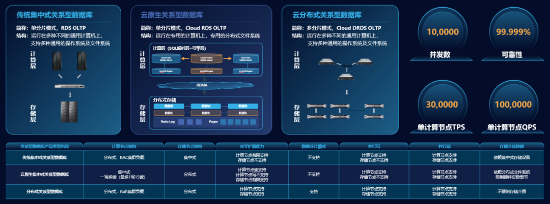 主流的数据库架构主要分如下三种:第一种架构是典型IOE主导的集中式架构,也是目前国产替代的主战场;第二种是云原生关系型数据库架构,适合公有云模式,但未能解决数据并发写操作的诉求,深度捆绑硬件设备型号及分布式文件系统,有一定的业务场景限制;第三种是我们这样的云分布式关系型数据库架构,计算存储分离,并且做到软硬平台完全解绑、芯片模块深度优化,从而可水平扩展做到1000万及以上的吞吐量能力。