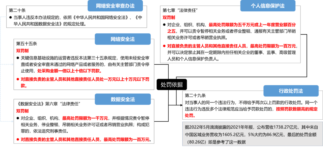 7月21日,国家互联网信息办公室发布滴滴案件处罚结果,依据《网络安全法》《数据安全法》《个人信息保护法》《行政处罚法》等法律法规,对滴滴全球股份有限公司处人民币 80.26 亿元罚款,对其董事长兼CEO程维、总裁柳青各处人民币 100 万元罚款。