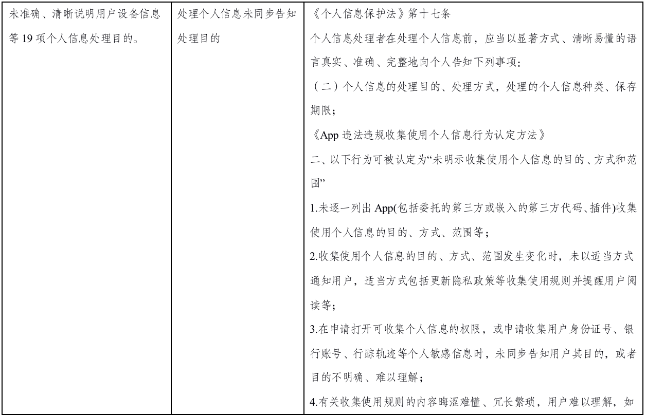 5、违法处理个人信息的情形。其违法行为涉及多个App,涵盖过度收集个人信息、强制收集敏感个人信息、App频繁索权、未尽个人信息处理告知义务、未尽网络安全、数据安全保护义务等多种情形。