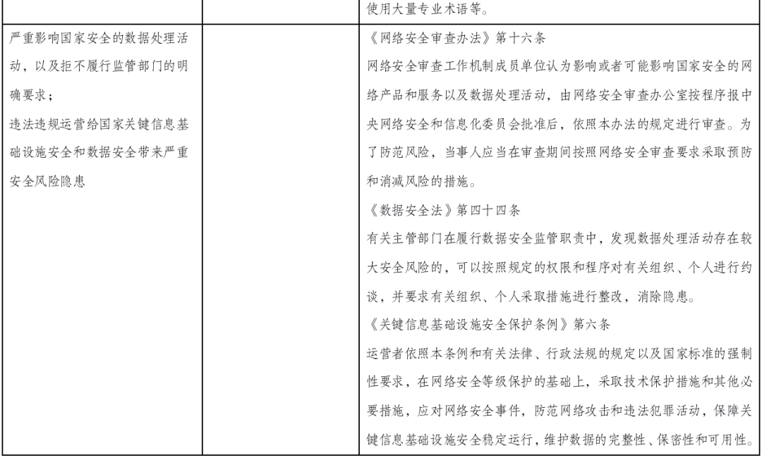 【说明2】目前关于违反网络安全、数据安全、个人信息保护相关法律法规的处罚方式主要有:一般情形通常是执法约谈、责令改正、警告、通报批评、罚款等,对于情节严重的可以责令暂停相关业务、停业整顿、关闭网站、下架、吊销相关业务许可证或者吊销营业执照、处理责任人等措施。