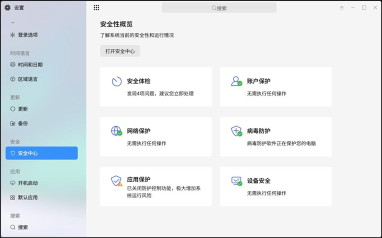 随着互联网科技的飞速发展,在全方位、高速化、开放化的网络环境中,操作系统安全在计算机系统整体安全中尤为重要。银河麒麟桌面操作系统V10(SP1)2203的更新推出,系统内置的安全中心已经拥有了强大的网络安全防护能力,除了可持续扫描恶意软件、病毒和安全威胁等实时保护之外,还可实现账户保护、病毒防护、设备使用安全等功能,主动帮助用户识别问题,并针对各类情况提供相应的设备保护建议,保障系统运行环境的安全和稳定。