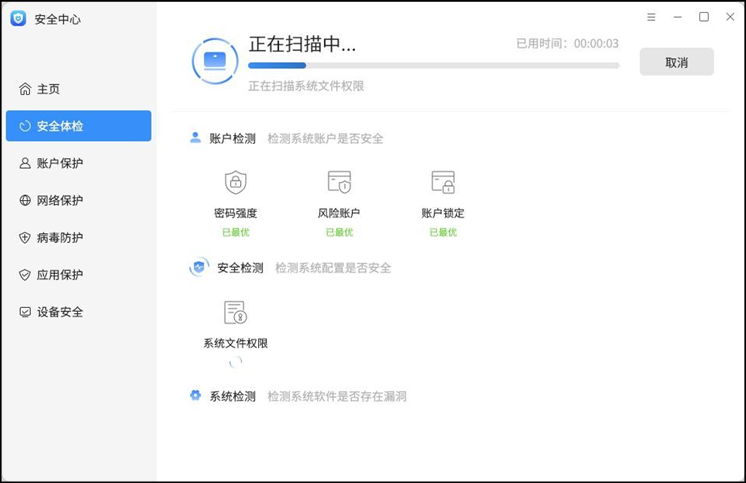 电脑体检作为最基础的PC端安全防护自检功能,它是操作系统安全的一道门槛。用户点击银河麒麟桌面操作系统V10(SP1)2203 “开始体检”按钮,会动态显示体检扫描进度,同步显示各体检项信息及体检结果。安全体检支持系统账户安全,系统配置安全,系统软件漏洞等多项检测,并且优化了单项修复功能,可及时发现和修复系统安全隐患,保障系统运行安全和稳定。