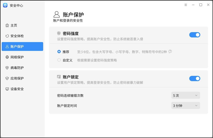 安全中心还提供系统账户密码强度策略配置,账户锁定策略配置功能,并且用户可以自行开启或关闭功能。开启状态时,系统账户需要遵循当前密码强度策略要求;关闭状态时,系统账户则无任何密码强度限制。账户保护提升了账户和登录的安全性,支持设置密码强度、支持设置密码连续输错次数、用户锁定时间,防止密码被暴力破解。