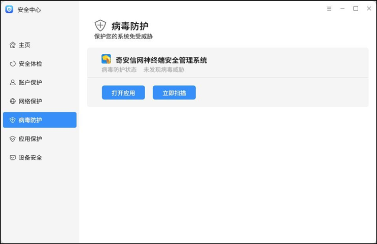 此外,病毒防护能够自动识别当前系统的病毒防护软件注册状态,保护用户的系统免受威胁。当系统已安装第三方病毒防护软件时,将自动显示可操作的第三方病毒防护软件,提供打开应用和立即扫描功能;如果系统未安装或已卸载病毒防护软件,安全中心界面将自动隐藏首页“病毒防护”按钮和左侧列表“病毒防护”标签页。