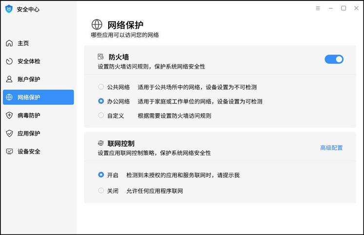 银河麒麟桌面操作系统V10(SP1)2203在系统安全方面带来了更加便利的网络保护和应用保护。一方面,经过系统持续迭代升级,网络保护已具备防火墙和联网控制功能。用户可以通过设置防火墙访问规则,保护系统网络安全性。当开启防火墙,系统会提供公共网络、办公网络、自定义三种访问模式让用户选择,而联网控制又能自动提示未授权的应用和服务联网,最大范围保护用户免遭网络攻击。