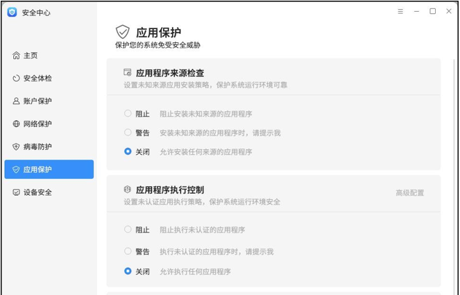 另一方面,应用保护功能还可检查应用程序来源、设置应用程序执行控制策略,检测文件损坏篡改状态,同时可进行应用防护控制,设置进程防杀死,避免系统关键内核模块遭受恶意卸载,保护系统运行完整性,免受安全威胁。