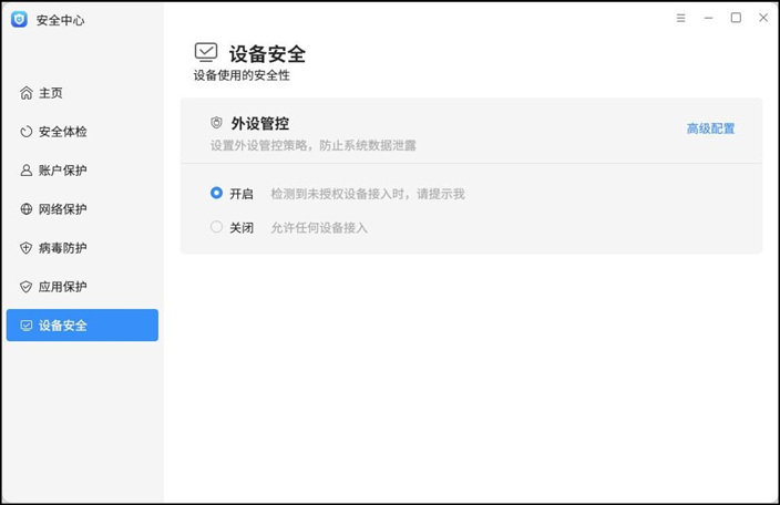 除了上述功能以外,设备安全则是安全中心另外一个相对较为重要的内置保护功能。它通过对USB 接口、无线网卡、有线网卡3类接口, USB 存储设备、摄像头、蓝牙设备和打印机4类设备,内置光驱、移动光驱和移动存储3类权限,以及未授权设备、设备策略和连接记录3个列表进行操作和管控,可实现已接入设备的追踪,查看接入记录,帮助用户保护设置内置核心部件的安全性,防止系统数据泄露。