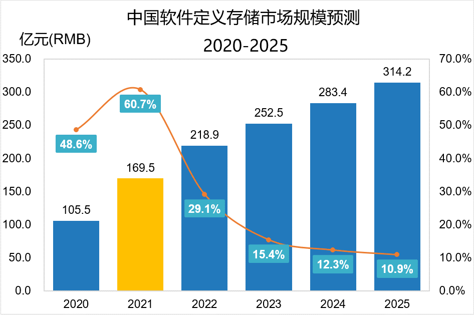 IDC报告数据显示,到2025年,预计中国数据圈将以48.6ZB的数据量成为全球最大的数据圈,其中,分布式存储持续高速增长,市场空间规模巨大,2025年市场份额将高达300多亿元人民币,相较2021年市场规模翻一番。