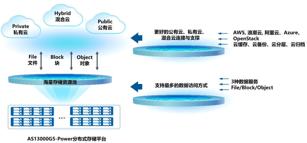 一套架构支持文件、块、对象三种数据服务类型;多协议支持,实现更好的公有云、私有云和混合云连接与支撑