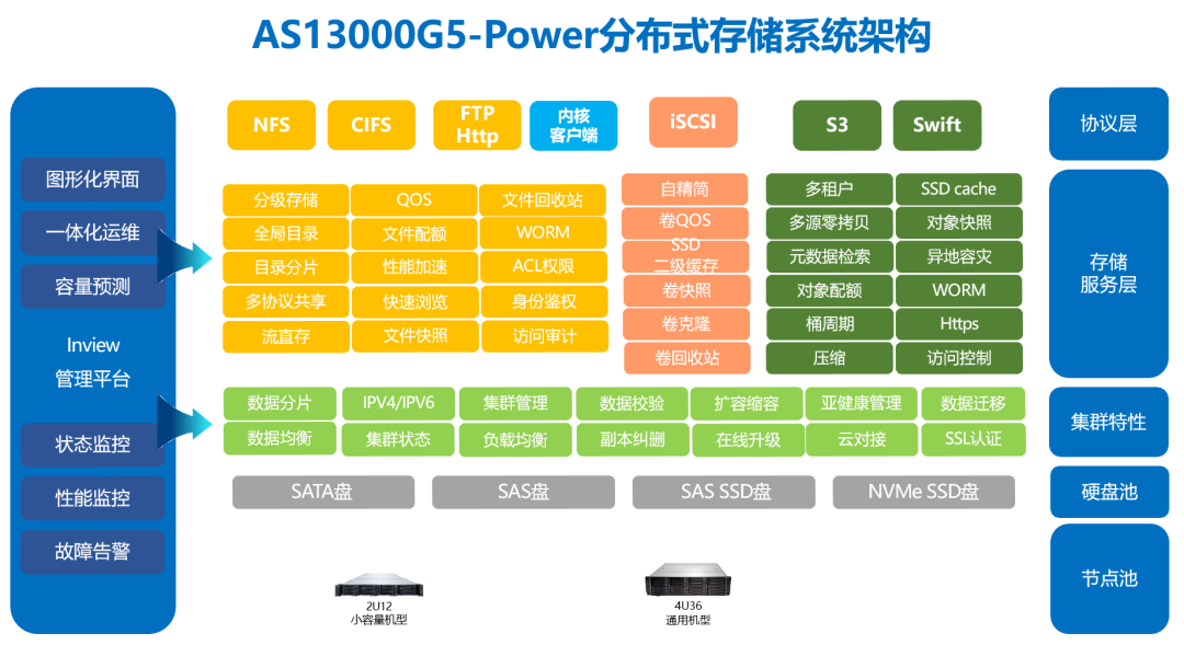 浪潮AS13000G5-Power分布式存储系统是基于融合架构、支持模块化装配的软件定义存储。整个系统以对象为数据存储的基础单位,采用全对称、去中心化软件定义架构,提供全局统一命名空间,将系统的数据和元数据平均分布到各个节点上,打破了传统系统的元数据集中式存储和管理这一限制,对系统目录实行分而治之,实现了负荷分担、负载均衡。即使系统中出现节点故障,系统也能够通过数据冗余规则以及故障修复迅速响应,恢复故障节点存储的数据及元数据信息,提供比传统存储系统更高的可靠性,其极致的容量、性能、可靠性、管理性能及高融合等特点,助力各行业更好地应对新业务和IT信息系统面临的数据量暴涨带来的挑战。