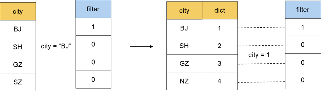因此如果我们使用字典的编码方式把字符串转变成整型,在 SQL 执行的很多阶段,都可以起到正向加速的效果。
