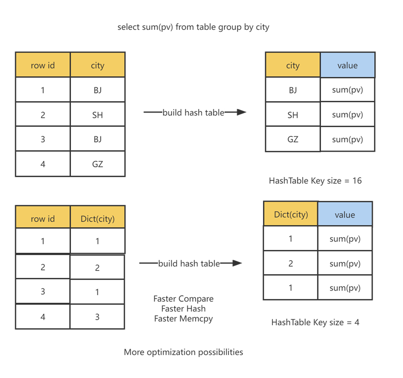 对于 Agg 操作,如果使用了字典编码,我们在聚合中可以使用编码之后的值作为聚合的 Key。如此一来,在聚合操作的 Hash 表构建和查找过程中,可以减少 Hash 表中 Key 的比较代价,同时也能够加快 Hash 值计算,节省内存空间,可以提升聚合操作的速度。