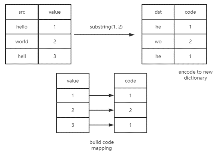 有了这个映射关系,对输入的数据,进行 substring 操作,那就很简单了,因为我们输入的数据是全局字典码,并不是原始的 String,我们只需要按着 substring 中两个字典之间的转换关系,将对应的字典码通过映射输出成对应的新字典码,就完成了相关函数的计算。