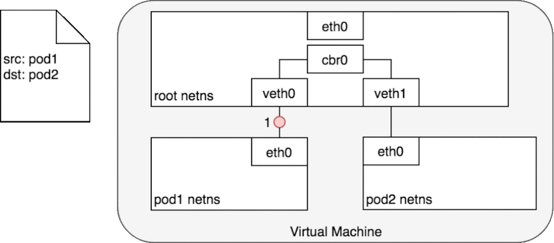 网桥 cbr0 中为 veth0 配置了一个网段。一旦数据包到达网桥,网桥使用ARP 协议解析出其正确的目标网段 veth1;