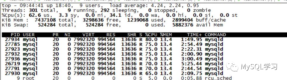 我们可以看到这里事务都处于活跃状态,大部分是unlock_row阶段,也有fetching rows阶段的事务,那么说明事务是在运行的,那么接下来通过CPU耗用确认是否会话出现了内部堵塞,如果长时间的堵塞CPU肯定会下降,如果是在耗用CPU干活就可能CPU就比较高,如下: