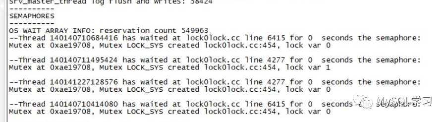 我们看到CPU还是比较高的,那么CPU高也有两种可能就是遇到spin 和 正常的代码逻辑,对于spin来讲一般是内部mutex在正式放弃CPU前做的多次尝试,这个和我们的参数innodb_sync_spin_loops/innodb_spin_wait_delay设置有关(一般没有设置保持默认值),并且show engine 可能会有输出,通过show engine进行确认如下: