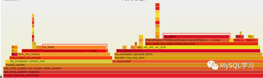 确实有大量的ut_delay耗用CPU,且函数指向了加行锁等待上,同时LOCK_SYS也正是row_lock的全局hash结构所在位置的mutex,这就说明了这个语句出现了大量的row_lock需要加锁和解锁,导致LOCK_SYS mutex出现了热点锁。