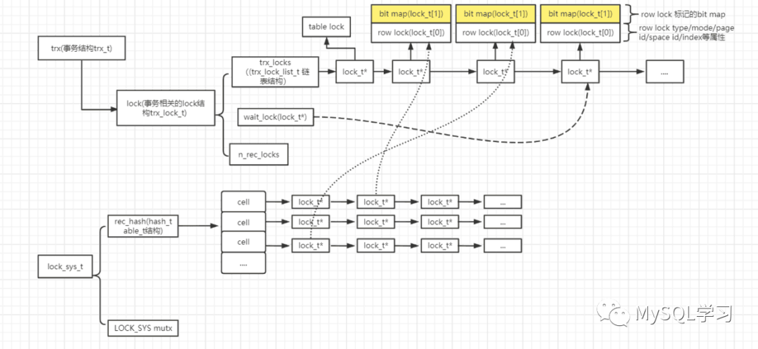 注意到这里的row lock和lock struct 都是比较多的,为什么会这样呢,经过unlock row和semi update过后锁定的行数应该是只有1行。为了更方便的讨论这部分,我们将涉及到的数据结构的元素画个简单的图,同时讲上面提到的lock_sys_t涉及的hash结构也画一下,需要注意的是这些数据结构元素很多很多,这里只话了和问题相关的部分,涉及得很少。