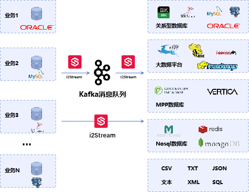 异构数据库实时复制同步场景,英方 i2Stream 不仅支持从源生产数据库直接传输至目标端异构数据库,也全面兼容 Kafka 生产和消费接口,将从在线日志中提取的变化数据传输至 Kafka 消息队列,再由消费端从 Kafka 消息队列读取数据并加载至其他目标数据库,实现异构平台之间的数据复制。