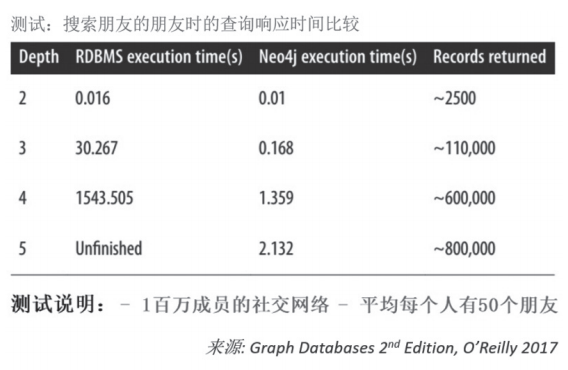 通过将关系预先物理存储在数据库中(我们称之为“原生”),图数据库将查询性能由原先的数分钟提高到数毫秒,特别是对于JOIN频繁查询,这种优势更加明显。图2中比较了在社交网络数据集上搜索朋友圈的查询,在原生的图数据库和关系数据库的查询执行效率。显然,使用图数据库比使用传统关系数据库效率有极大提升。