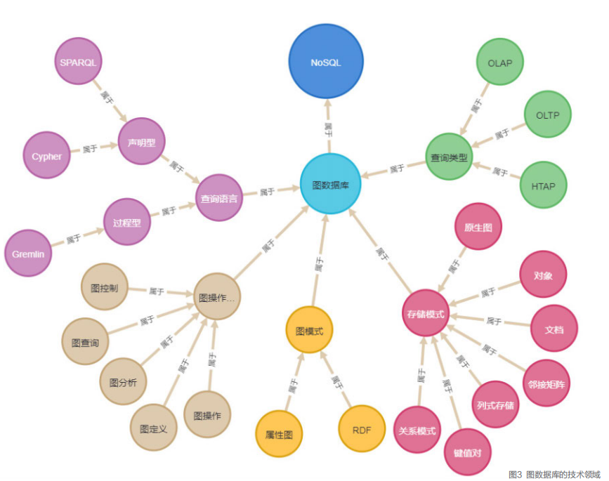 既然图数据库有诸多优势且发展迅速,那它主要涉及哪些技术领域呢?我们用图3来描述。具体来讲,图数据库的主要技术领域包括存储模式、图模型、图查询语言、图分析以及图可视化。