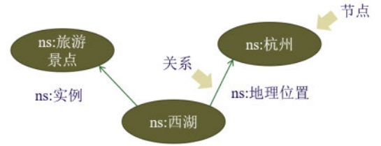 我们来看看RDF是怎样描述 “西湖是位于杭州的一个旅游景点”这个事实的(见图4)。