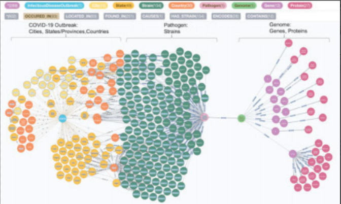 2019年,当新冠病毒开始在全球肆虐时,来自Neo4j图数据库社区的一群成员集成了多个异构生物医学和环境数据集(https://github.com/covid-19-net/covid-19-community),建立了关于新冠病毒的知识图谱,以帮助研究人员分析宿主、病原体、环境和病毒之间的相互作用。图7是该知识图谱的部分可视化结果,图中最左边的部分是病毒暴发的地理位置子图,包含国家、地区、城市;中间绿色的部分是流行病学子图,包括有关病毒株、病原体和宿主生物的信息,病例和菌株分别与报告和发现它们的位置相关联;右边紫色的部分是生物学子图,代表生物体、基因组、染色体、变异体等等。
