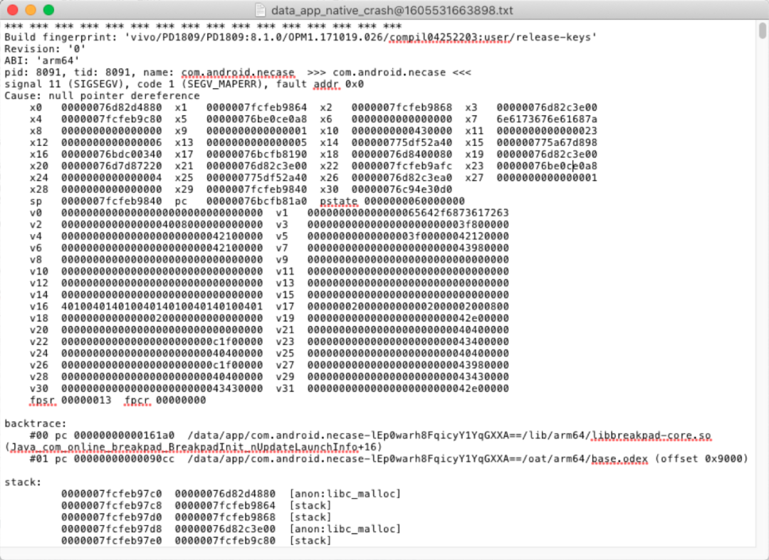 ndk-stack -sym Users/njvivo/Desktop/NE -dump data_app_native_crash@1605531663898.txt********** Crash dump: **********Build fingerprint: 'vivo/PD1809/PD1809:8.1.0/OPM1.171019.026/compil04252203:user/release-keys'#00 0x00000000000161a0 data/app/com.android.necase-lEp0warh8FqicyY1YqGXXA==/lib/arm64/libbreakpad-core.so (Java_com_online_breakpad_BreakpadInit_nUpdateLaunchInfo+16)Crash()/Users/njvivo/Documents/project/Breakpad/breakpad-build/src/main/cpp/breakpad.cpp:111:8Java_com_online_breakpad_BreakpadInit_nUpdateLaunchInfo/Users/njvivo/Documents/project/Breakpad/breakpad-build/src/main/cpp/breakpad.cpp:122:0#01 0x00000000000090cc data/app/com.android.necase-lEp0warh8FqicyY1YqGXXA==/oat/arm64/base.odex (offset 0x9000)Crash dump is completed