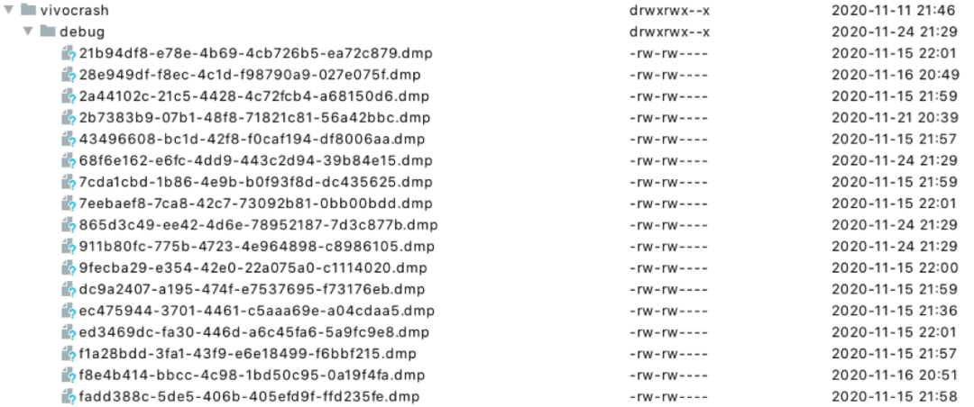 在应用发生NE时,BreakPad会在手机本地生成一个dump文件,如图所示: