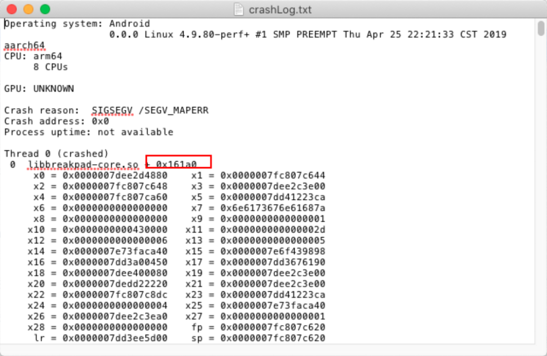 3、根据解析出的NE信息,关注图中红框,可以得知,这个崩溃发生的 libbreakpad-core.so 里面,0x161a0代表崩溃发生在相对根位置偏移161a0的位置