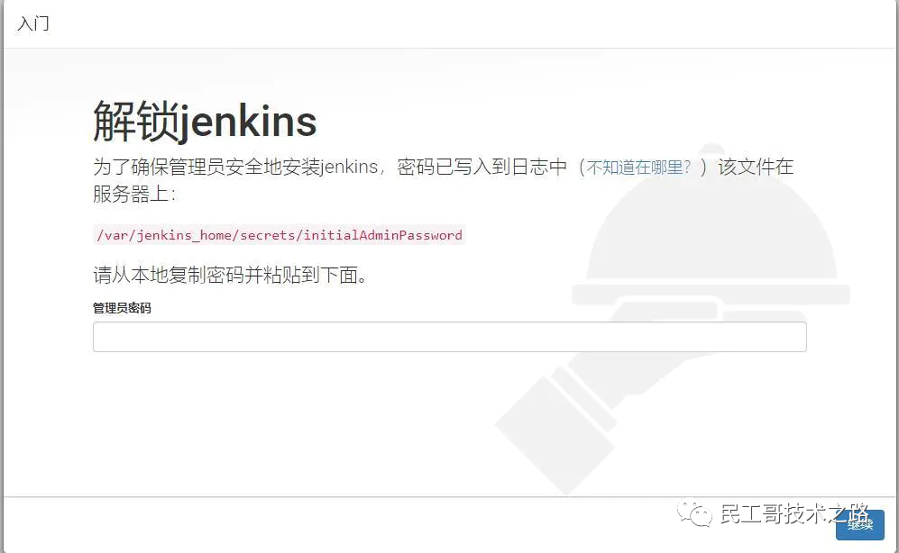 在 解锁Jenkins 页面, 粘贴密码并继续。