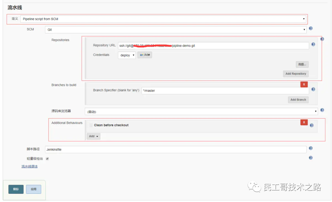 进入任务的配置界面,在流水线(pipeline)设置部分,选择“Pipeline script from SCM”。SCM选项选为“Git”,配置好工程的git地址以及获取代码的凭证信息。然后在“Additional Behaviours”中添加“Clean before checkout”。