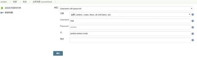 选择“凭据”,然后在下图所示位置点击“添加凭据”。在新凭据设置界面,类型选择为“Username with password”,ID设置为“jenkins-harbor-creds”(此处的ID必须与Jenkinsfile中的保持一致)。Username与Password分别设置为harbor镜像私库的用户名和密码。