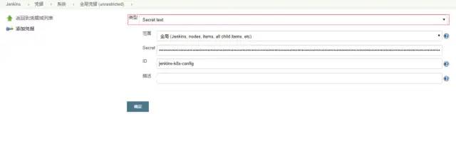 然后类似上一步,在jenkins凭据中增加配置文件内容。在凭据设置界面,类型选择为“Secret text”,ID设置为“jenkins-k8s-config”(此处的ID必须与Jenkinsfile中的保持一致),Secret设置为上面经过base64编码后的配置文件内容。