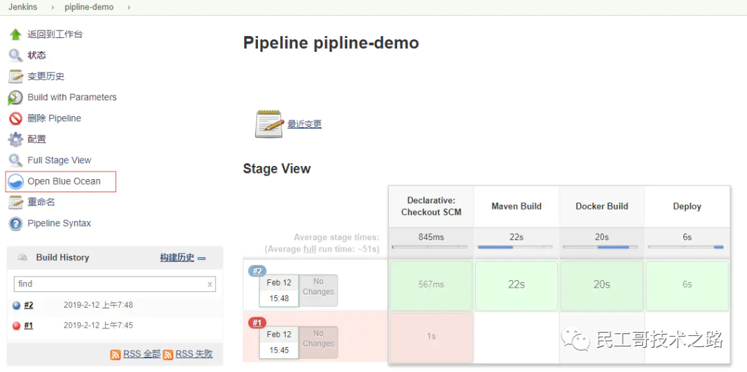 在jenkins中存在一个名为Blue Ocean的新界面,在新界面中也可以执行pipeline任务,而且新的界面中查看任务的执行结果更加清晰,所以执行结果日志建议在新界面中查看。点击“Open Blue Ocean”菜单进入新界面。