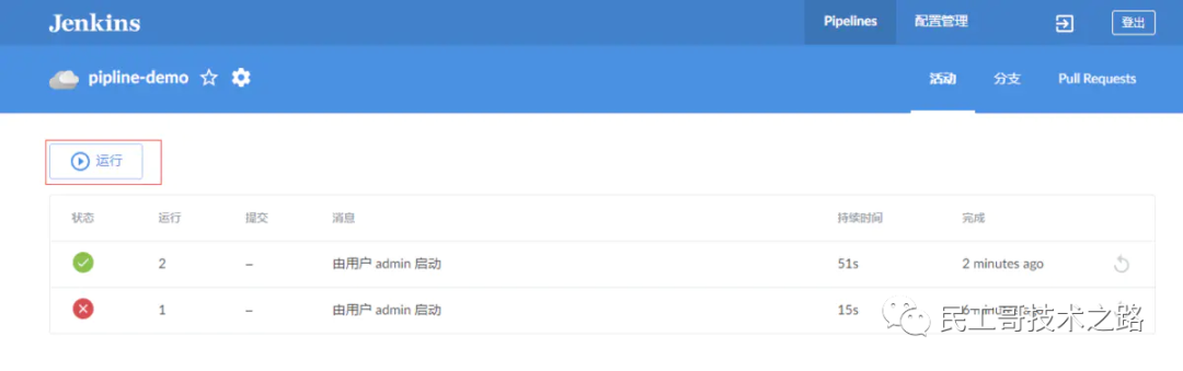 在Blue Ocean新界面中,可以点击“运行”执行pipeline任务。