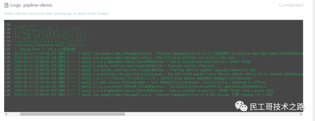 执行成功后,查看k8s中pod运行日志,服务启动成功。