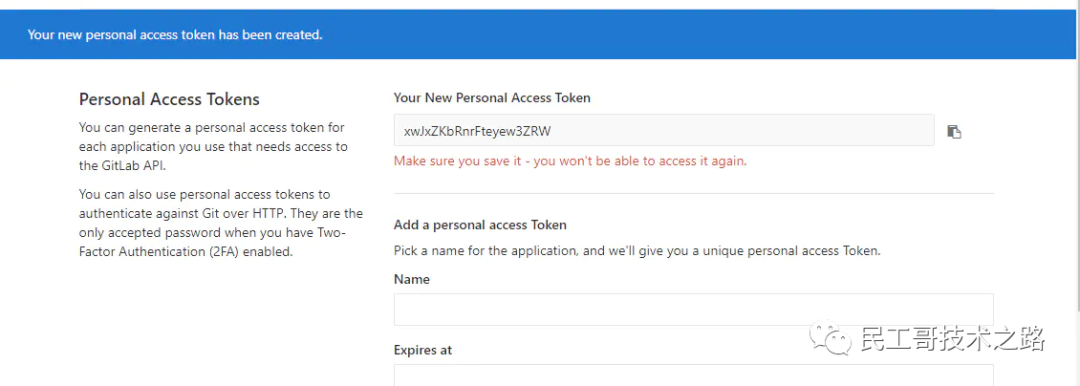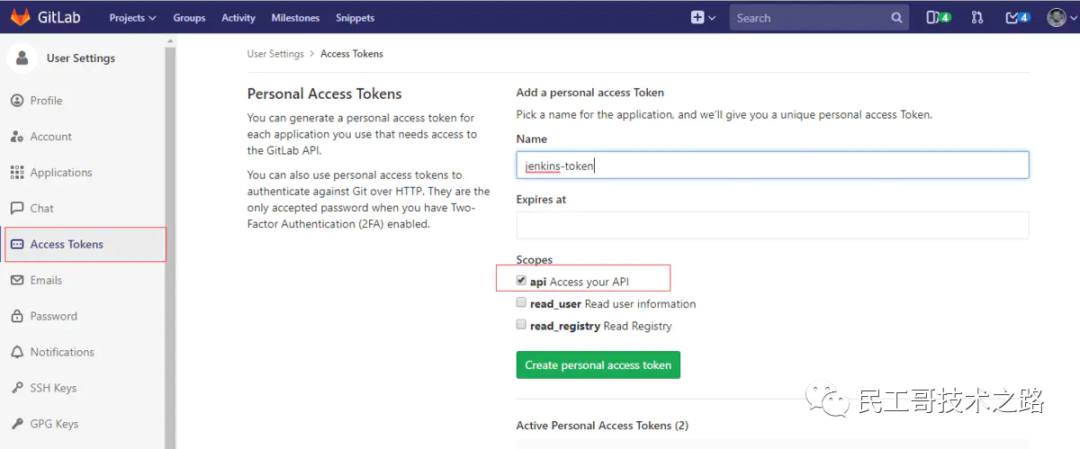 安装的gitlab插件在配置时,需要gitlab的访问token,先要在gitlab中创建访问的token。点击“用户设置”-“Access Tokens”菜单,进入访问token设置界面。然后输入“Name”,并在“Scopes”中勾选“api”,点击“Create ...”按钮即可创建访问token。创建成功后,一定要将生成的token保存下来,后面将无法再查看生成的token,如果未保存后面只能重新生成。