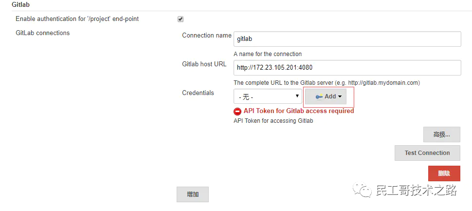 输入“Connection name”、“Gitlab host URL”,在“Credentials”中点击“Add”添加gitlab的授权token。