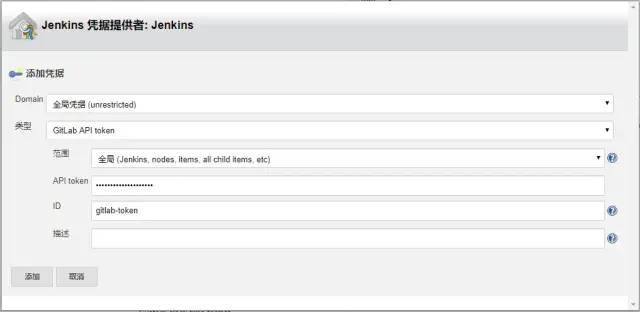 点击添加后,会进入添加凭据界面。在添加界面,选择类型为“GitLab API token”,API token设置为前面在gitlab中创建的token值。然后点击“添加”按钮创建凭据。