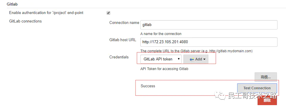 添加完gitlab api token,在Gitlab设置界面“Credentials”中选择前面添加的token,然后点击“Test Connection”测试是否成功。测试成功后保存。