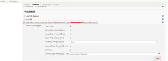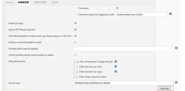 进入jenkins的任务设置界面,在“构建触发器”中,勾上“Build when a change pushed to Gitlab.Gitlab webhook URL ...”(这里的webhook URL在后面配置gitlab时需要),根据自己的需要设置其它的选项。点击“高级”按钮,然后点击“Generate”按钮生成Secret token(这里的token后面配置gitlab时需要)。
