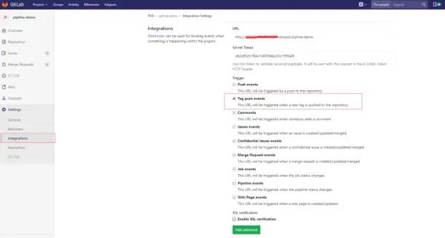 在gitlab的项目设置中选择“Integrations”,然后在URL和Secret token中填入上一步jenkins设置中的到的内容。由于本文中是在git上打了tag后才触发jenkins执行任务,所以这里勾选“Tag push events”,然后去掉“Enable SSL verification”的勾选项,并点击“Add webhook”按钮添加。如果需要每次提交代码都触发则应该选“Push events”(注意:这里选择Push events后,Jenkinsfile中也需要做相应的修改,去掉git的tag相关内容,否则执行时会出错)。