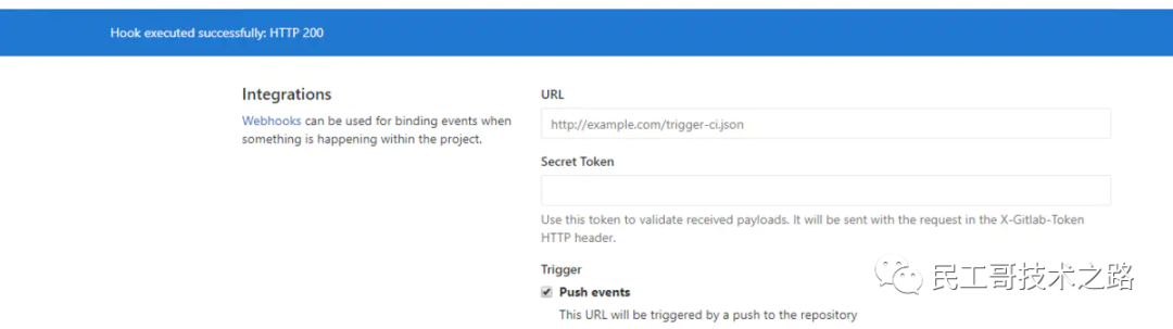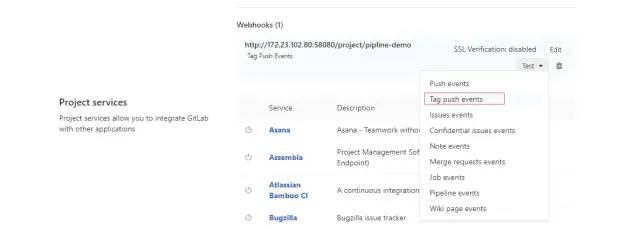 添加完成后,在下面可以看到刚才添加的webhook,点击“Test”按钮在弹出的菜单中选择“Tag push events”发送测试请求,发送成功后会显示“Hook executed successfully”信息。