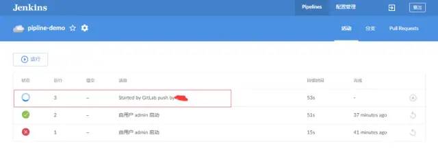 webhook发送成功后,到jenkins中可以看到正在执行触发的任务。配置成功后,后面只要有git的tag提交到gitlab即可直接触发jenkins执行pipline任务。