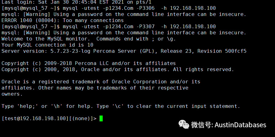 我们通过3307 的预设的端口进行访问是可以的, 这个方法可以弥补这个连接打满的问题