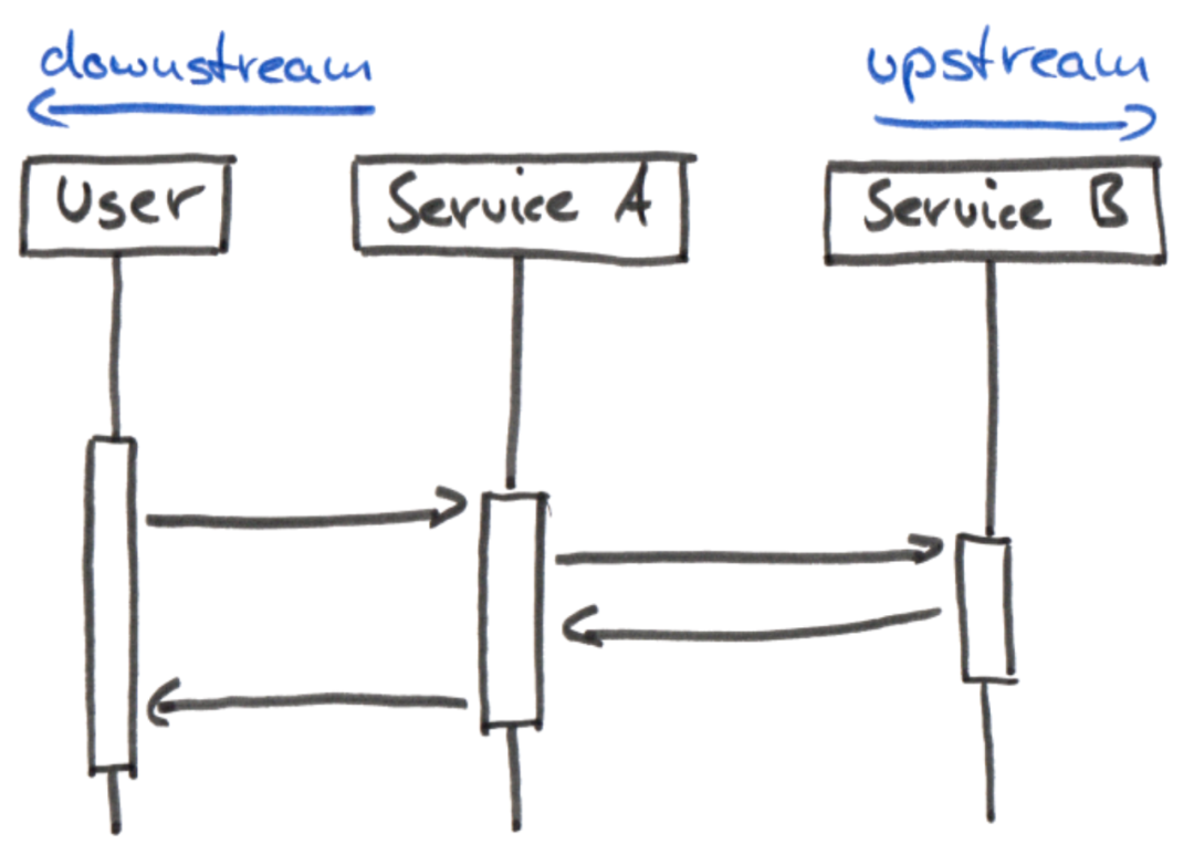 上面这张图来自这篇文章[1],文中介绍了好几种 downstream/upstream,但对于后端研发来说,弄清服务调用间的上下游就足够了。